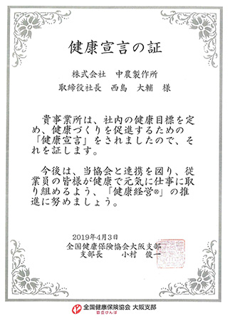 中農製作所では、企業全体で社員の健康づくりに取り組むことを宣言。全国健康保険協会より認定を受け、職場の健康経営・健康づくりをさらに進め、安全衛生の向上にも取り組んでいます。
